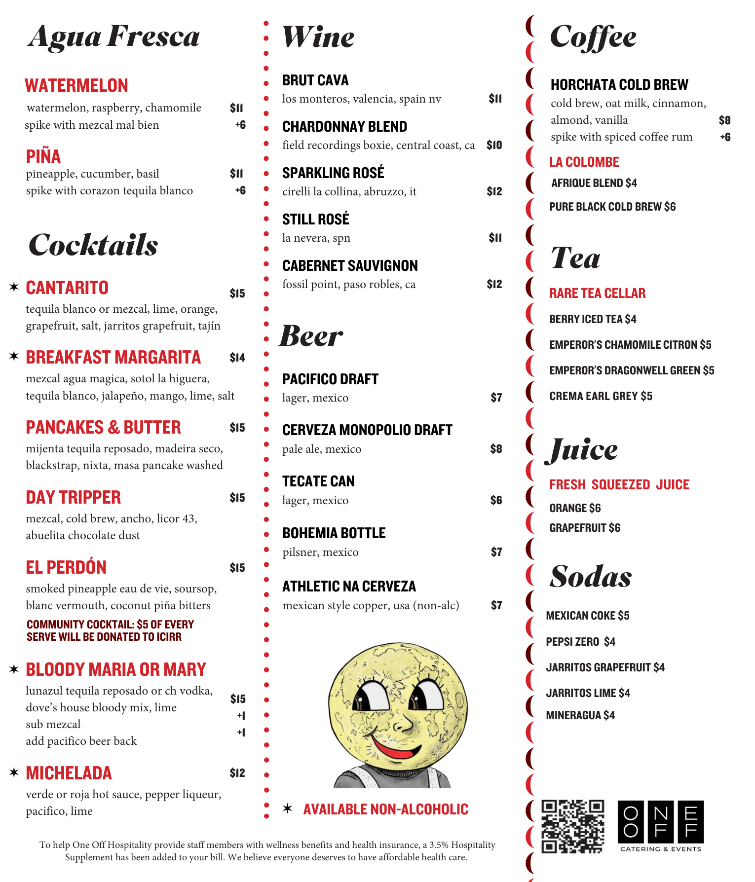 To help One Off Hospitality provide staff members with wellness benefits and health insurance, a 3.5% Hospitality Supplement has been added to your bill. We believe everyone deserves to have affordable health care.